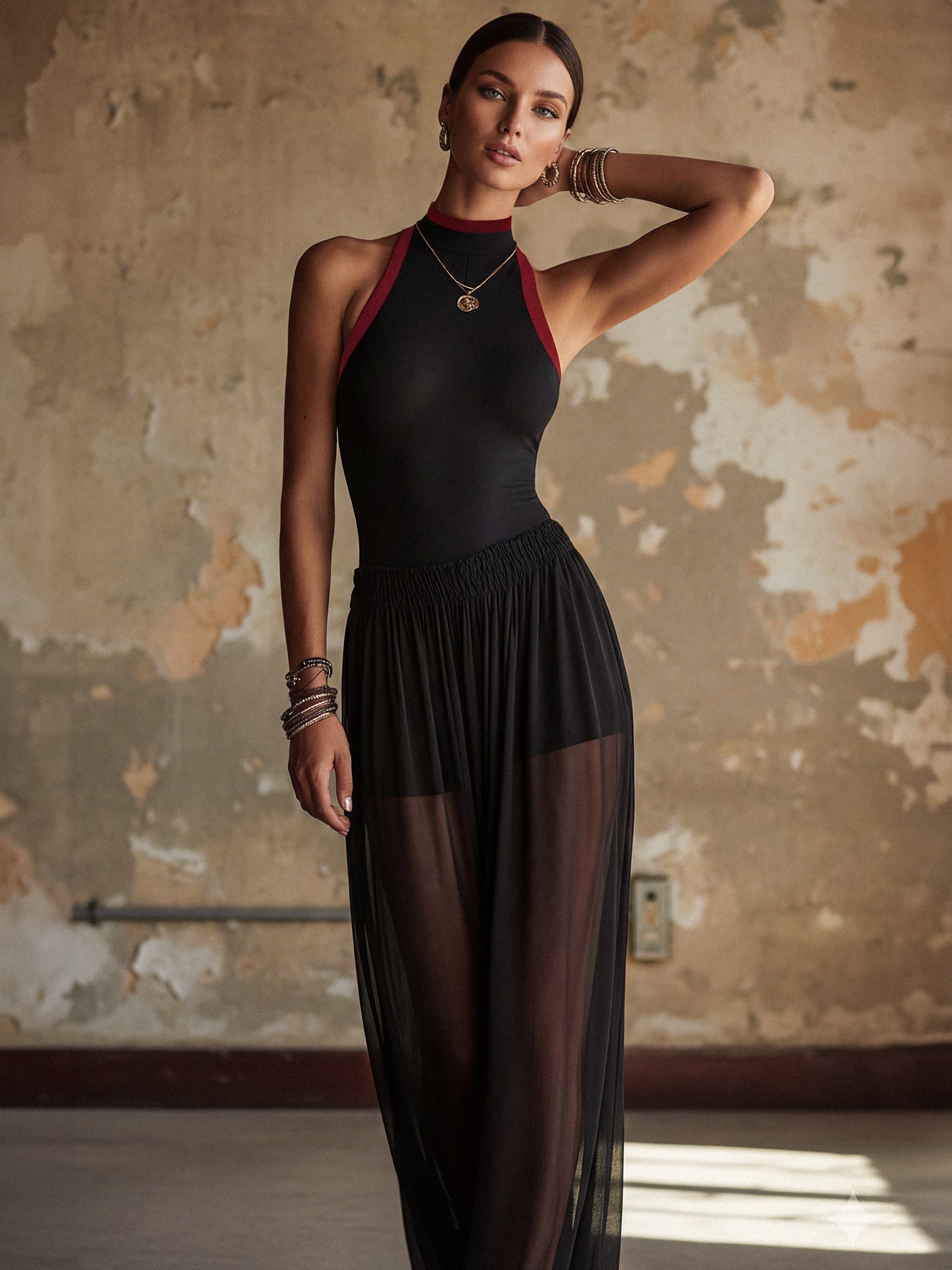 Black Knit Sleeveless Maxi Dress With Polka Dot Mesh Patchwork