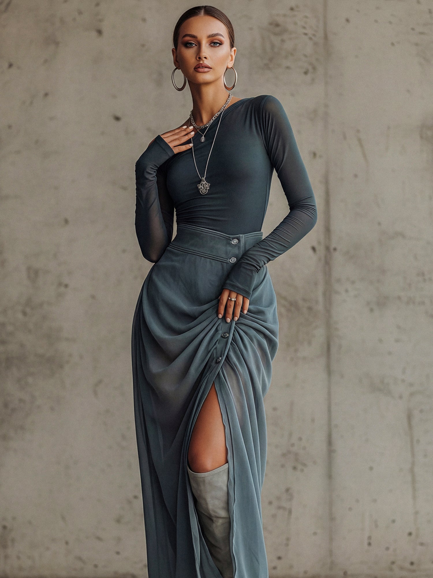 Emerald Green Velvet Mesh Sleeve High Slit Maxi Dress