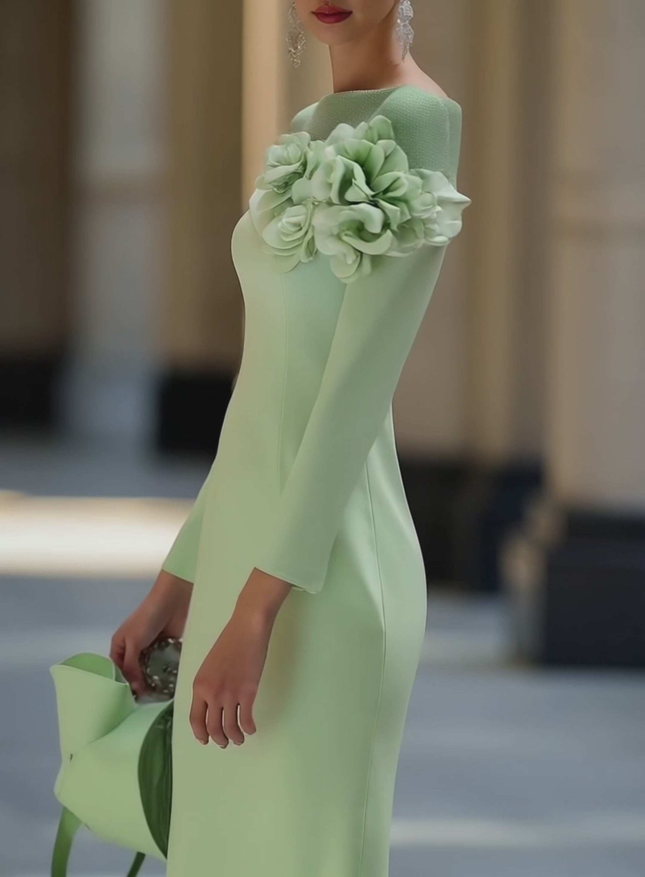 - Design: Midi pencil dress featuring a neckline with green mesh splicing, adorned with 3D floral decorations. Long sleeves for an elegant touch.
