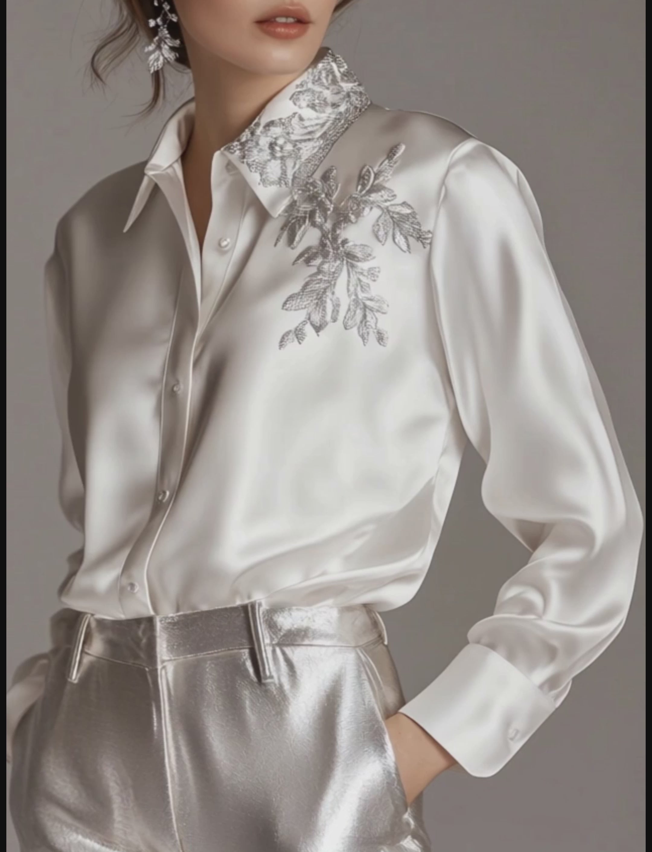 This white satin blouse with silver botanical embroidery combines classic elegance with a touch of modernity. The attention to detail in the collar and embroidery makes it an ideal choice for occasions that call for sophistication and style.