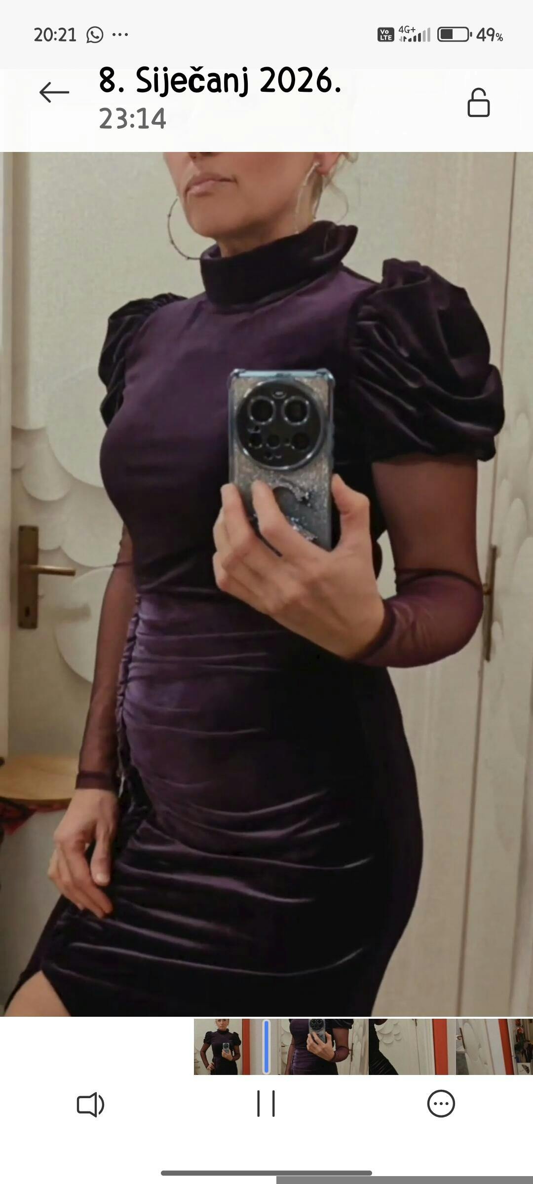 Material: Crafted from luxurious plum-colored stretch velvet, paired with semi-sheer mesh sleeves, this dress offers an elegant blend of softness, richness, and structured comfort. The fabric has a subtle sheen that elevates its sophistication.